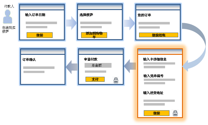 Hosted Payment Form模式为您提供了灵活性,您可以将发起付款与收集卡详细信息分离。这意味着您可以在收集卡详细信息时发起付款,也可以在结账流程的以后阶段发起。能够很好地说明后一种情况的示例如:当付款单收集优惠券代码等其他信息时。此信息可能有助于计划总付款金额。例如,某在线比萨店的网站可能包含以下页面。